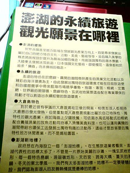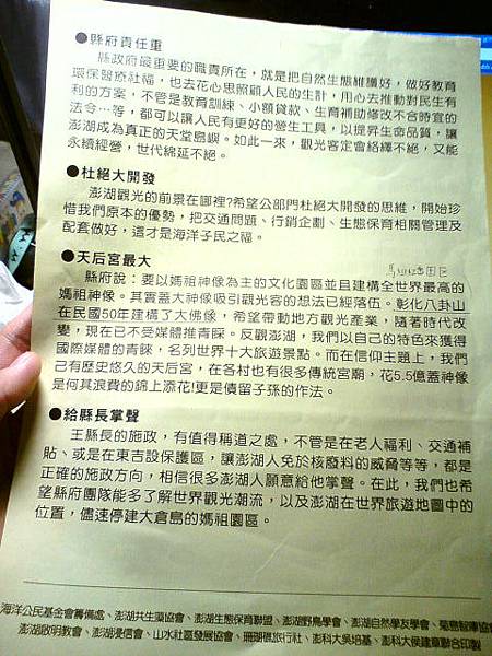 [1]下午三點整,我來到了澎湖縣議會,這是自己有生以來第一次親自投身於公民運動,沒有真得綁布條舉牌子大聲抗議,反而是默默在一旁記錄、觀察、體驗。不過這也是一種用身體力行實際表達對於自己土地的關心。